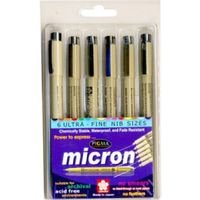Quick ViewDrawing Pens- This is a set of 6 assorted pens with varying nib sizes in black colour ( 0.2 mm, 0.25 mm, 0.3 mm, 0.35 mm, 0.45 mm and 0.5 mm). These are chemically stable, waterproof, and fade resistant. It ensures no smears /feathers, or bleed-through on most papers.
